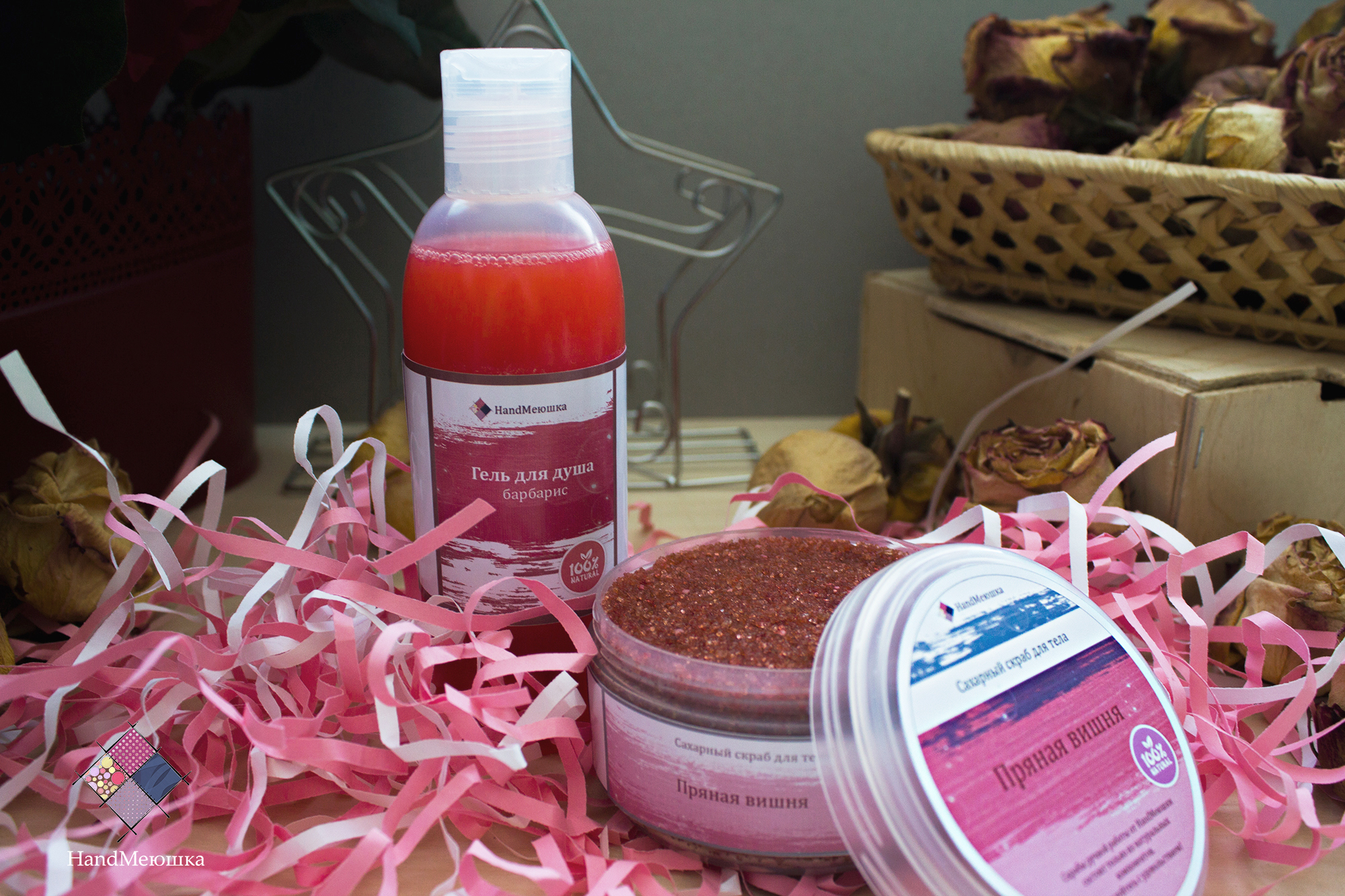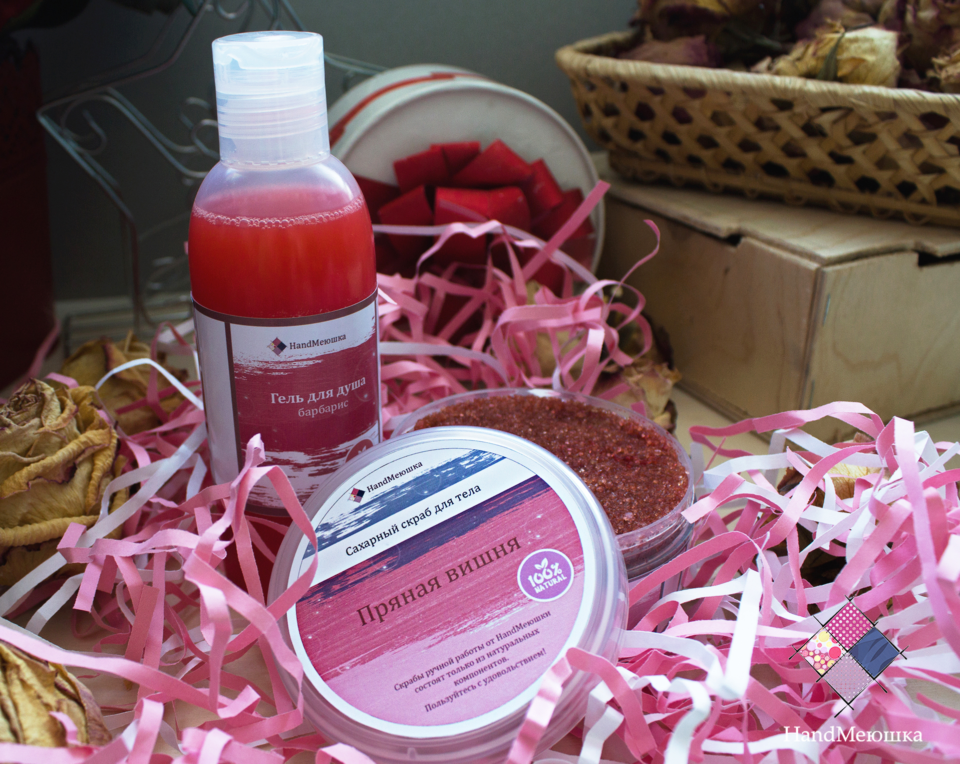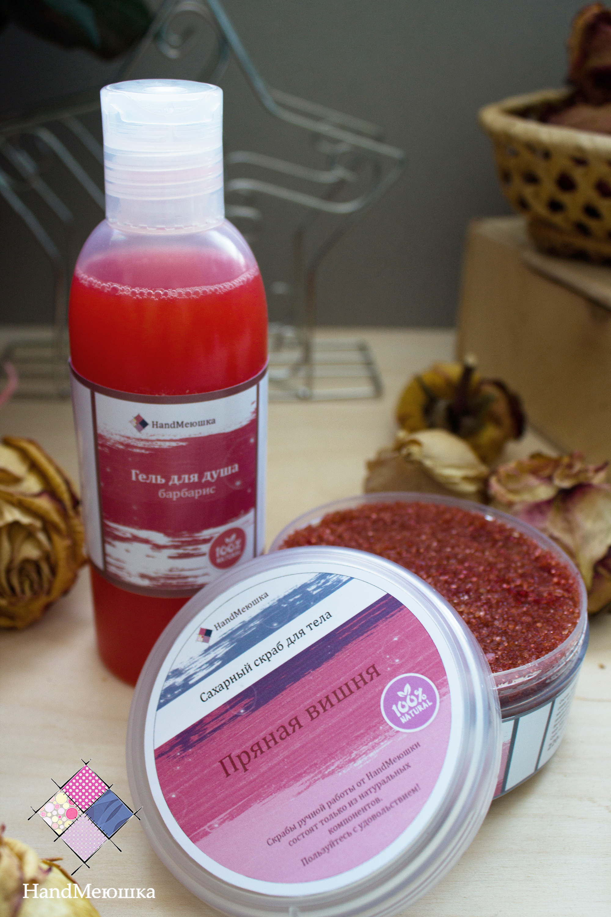 В данный набор входит : 1. Сахарный скраб "Пряная вишня" (220 грамм) 2. Гель для душа " Барбарис" (200мл)