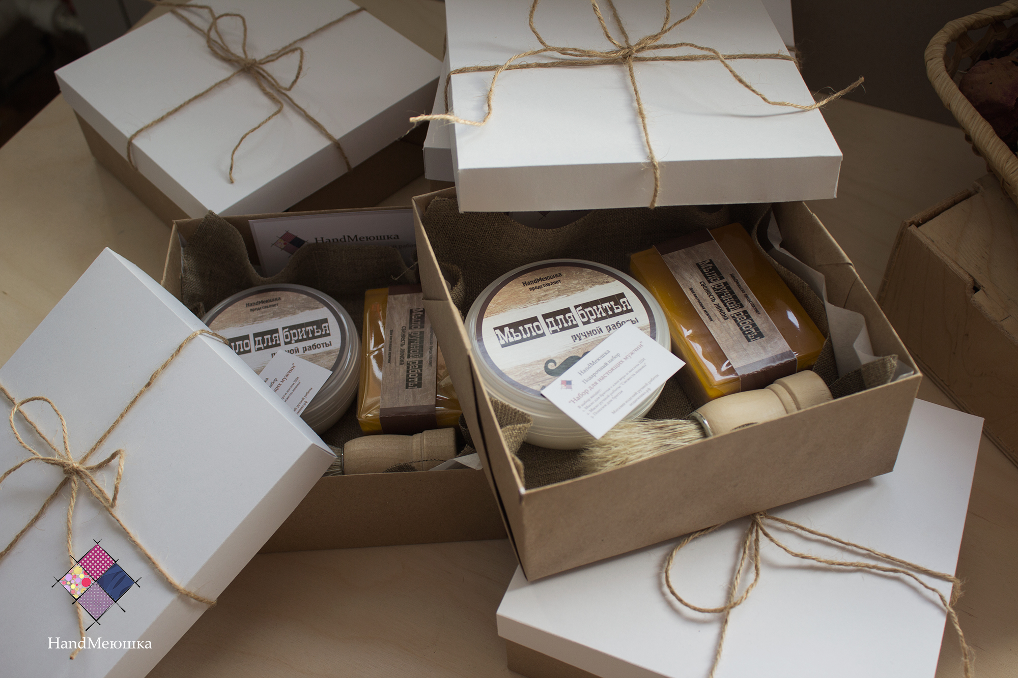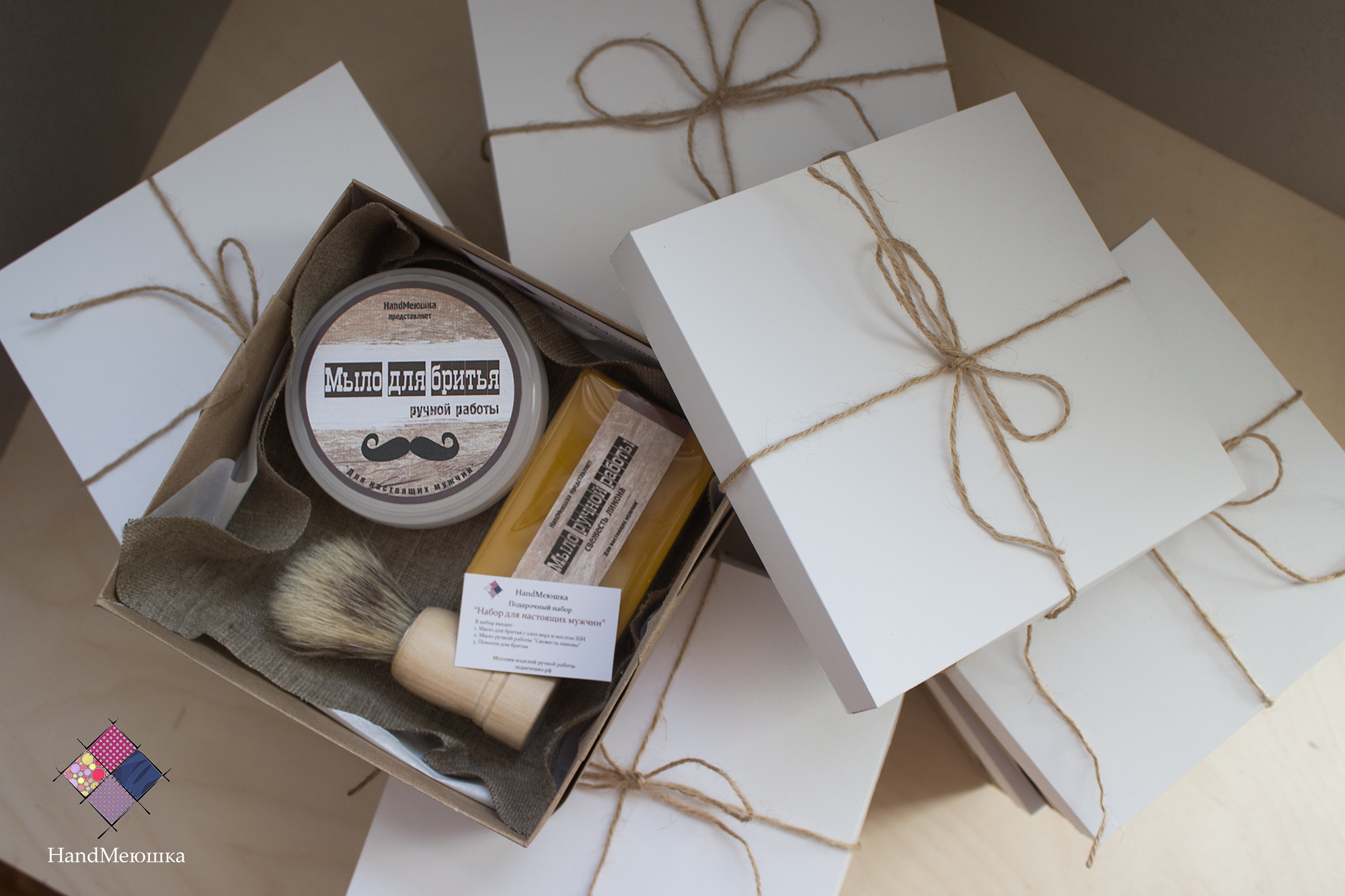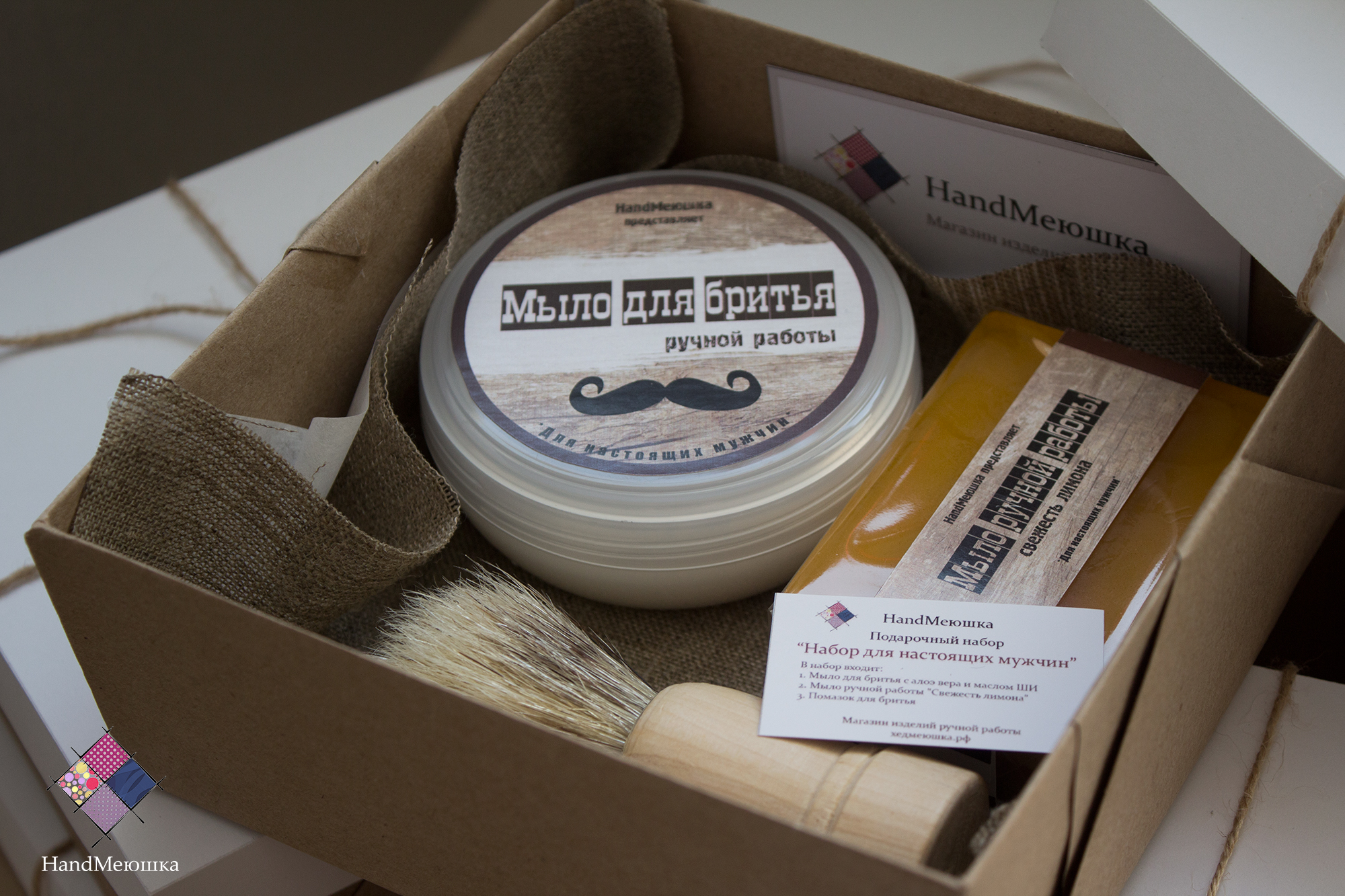 В данный набор входит : 1. Мыло ручной работы "Свежесть лимона" 2. Мыло для бритья с алоэ вера и маслом ШИ 3. Помазок для бритья)