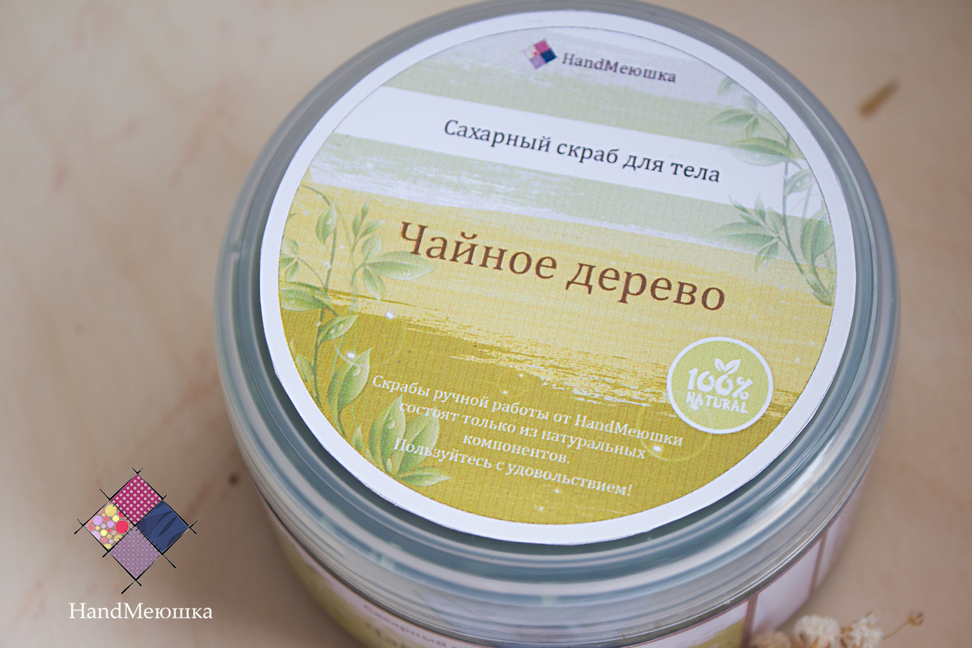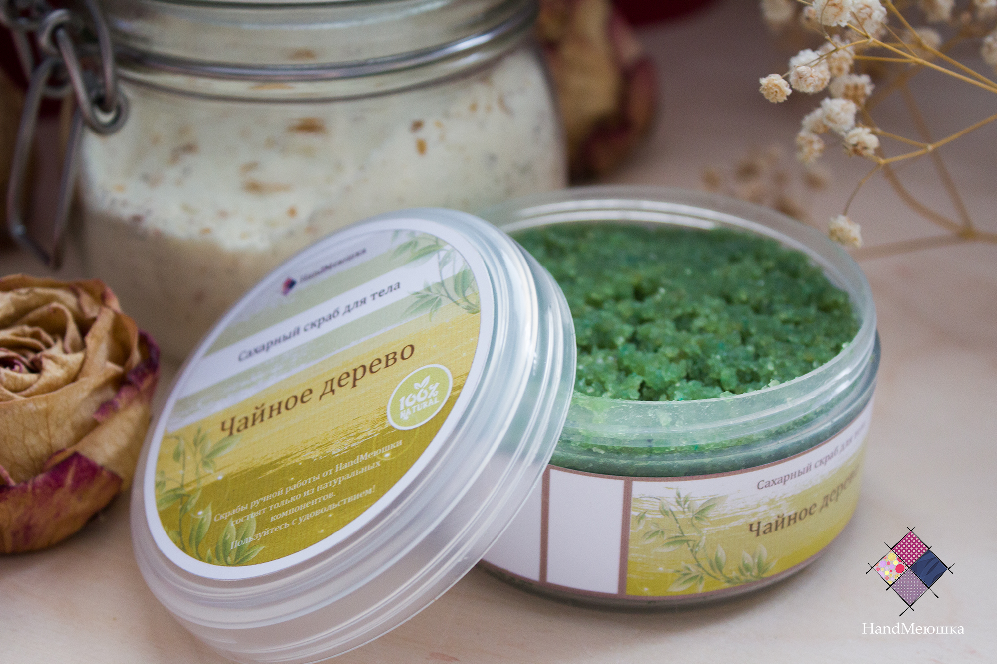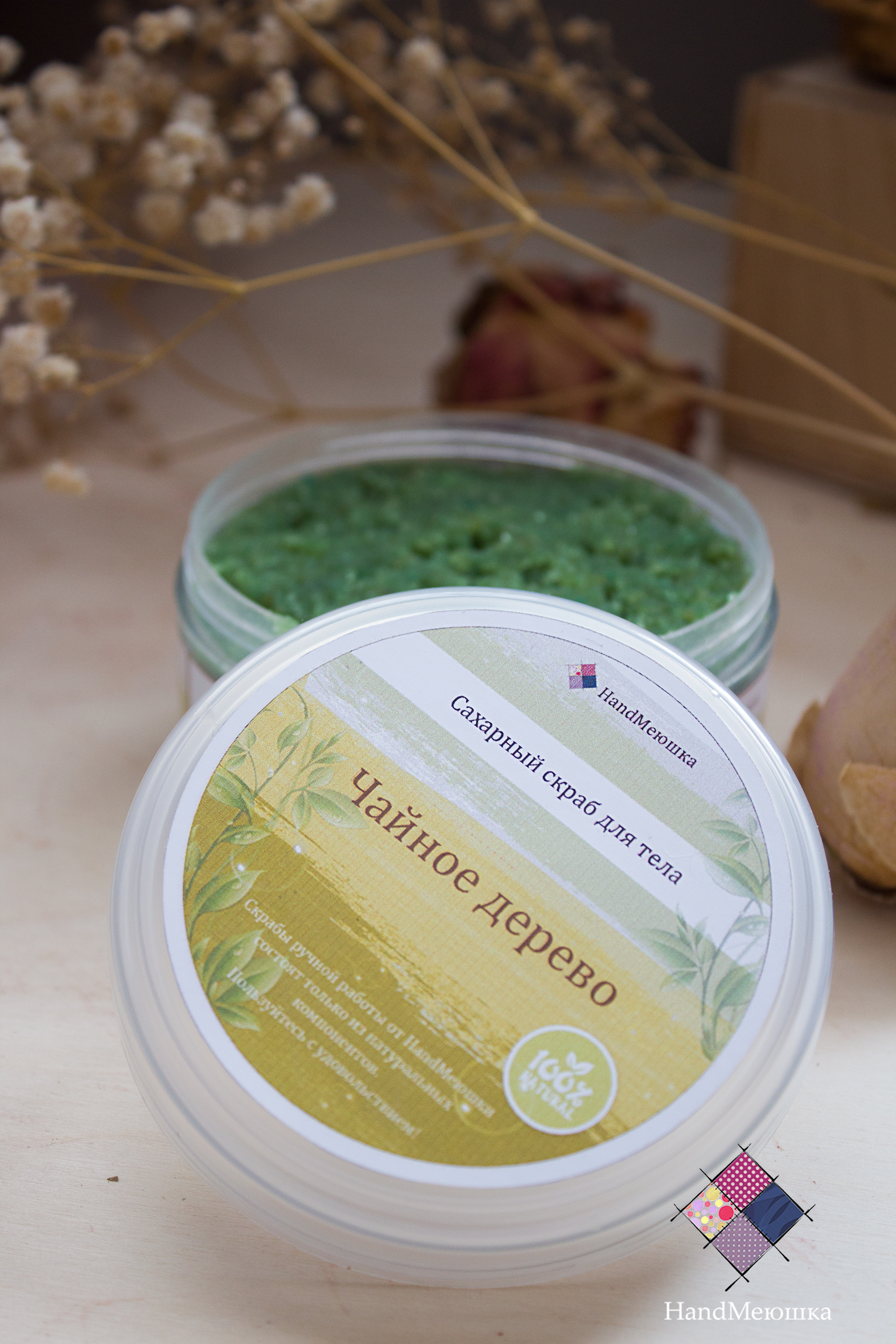 нерафинированный тростниковый сахар, масло оливковое, кремовая основа,экстракт череды, масло шиповника, эфирное масло чайного дерева, ароматизатор,краситель