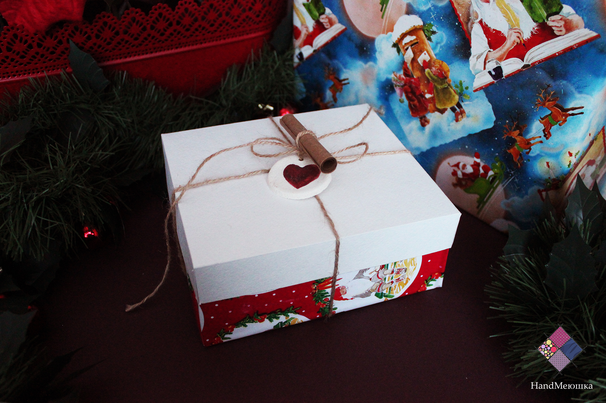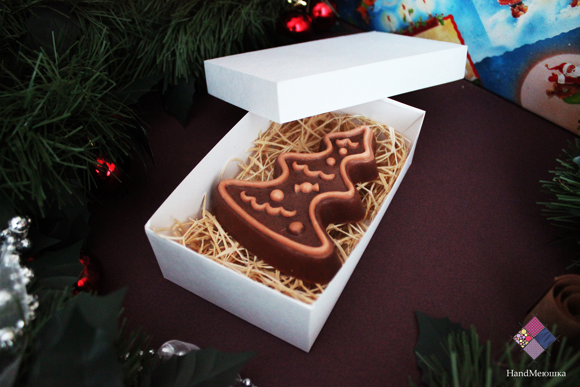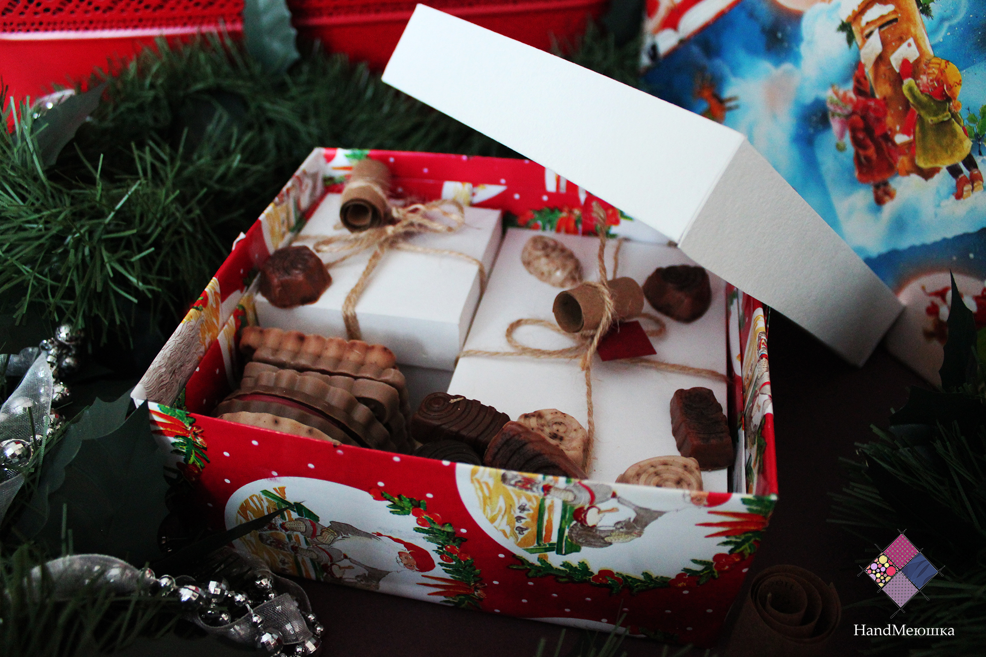 В данном наборе находится: 1 косметическое мыло (Шоколадное), 1 мыло "Пряничная ёлочка" , мыло "печеньки" а также конфеты. Все упаковано в отдельные коробочки. У каждой коробочки привязан свиток , на котором описано её содержимое.
