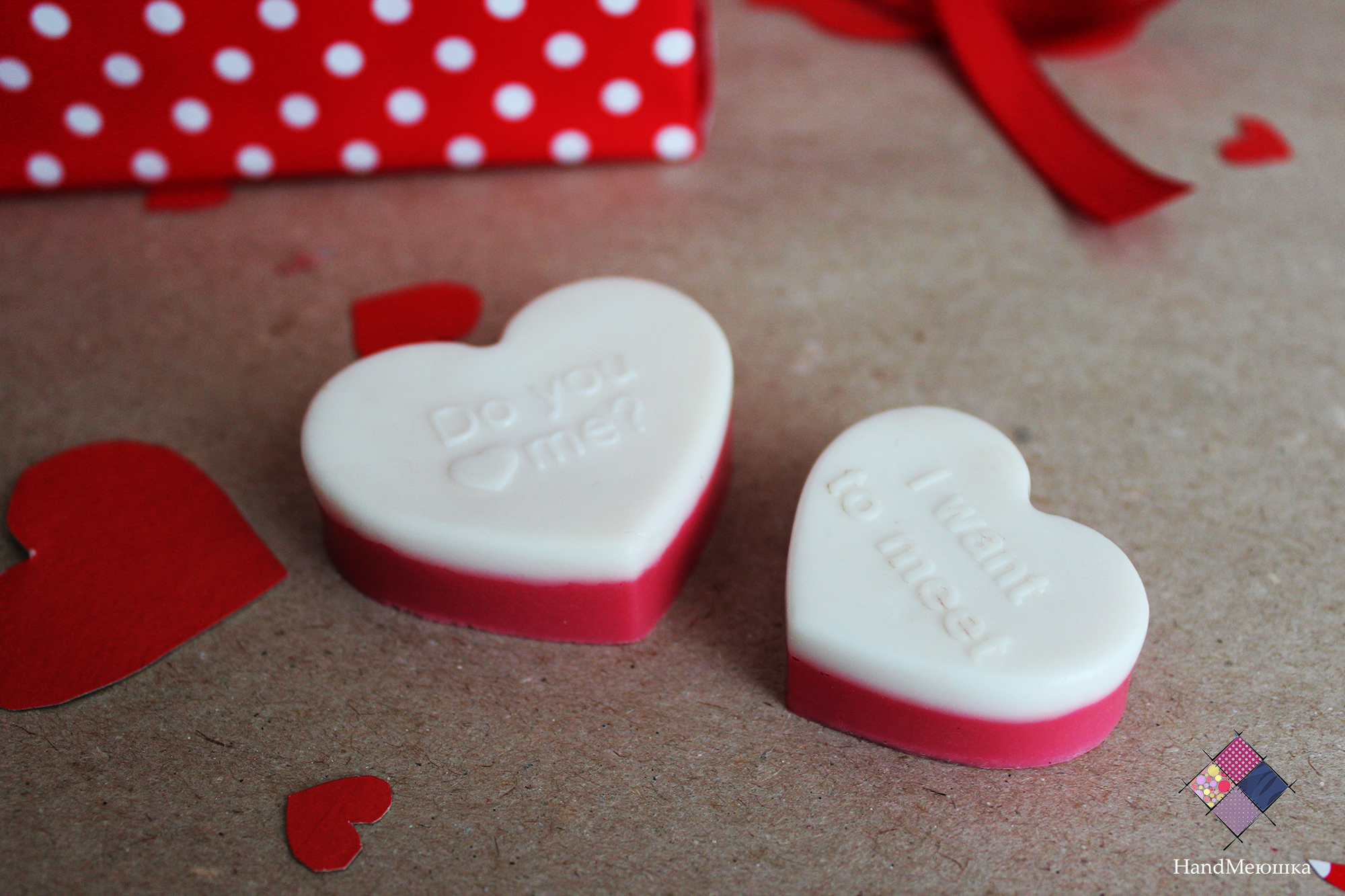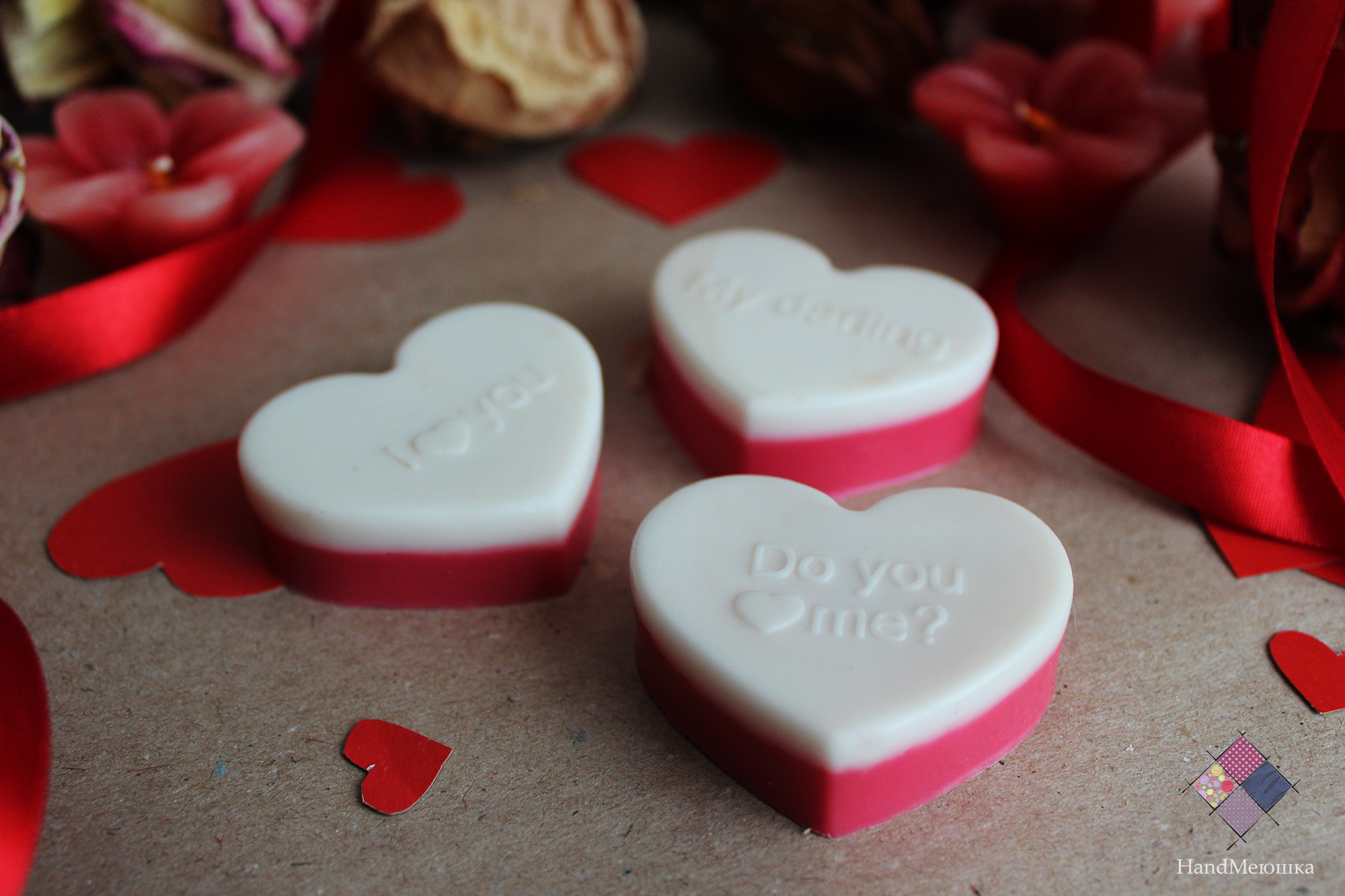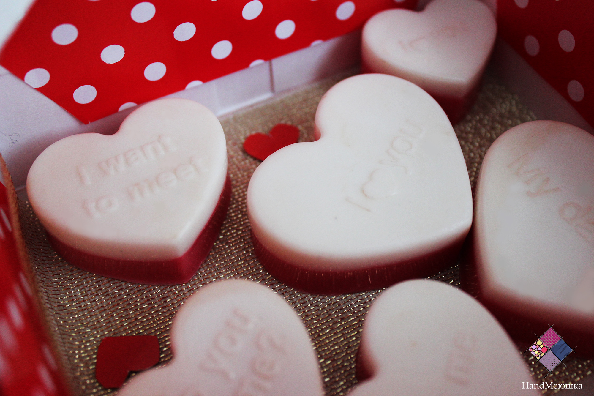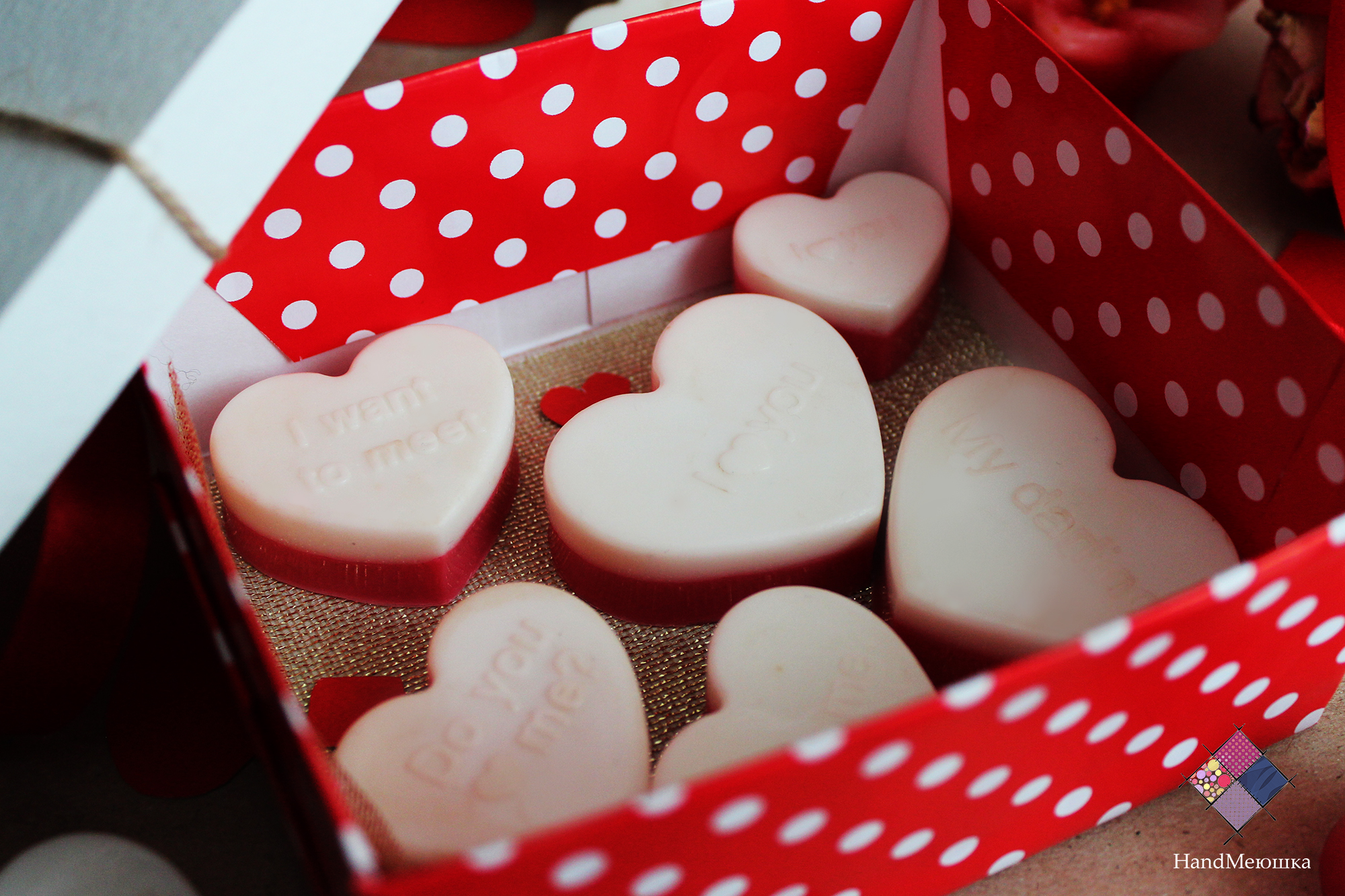 В комплекте идут 5 сердечек с признаниями в любви. Данное мыло упаковывается в коробочку. Такой подарок отлично подойдет вашим любимым ко Дню влюбленных. Мыло обладает ароматом свежих ягод : клубники и вишни.
