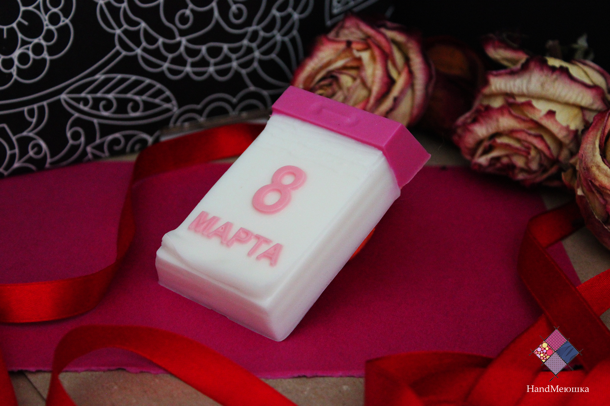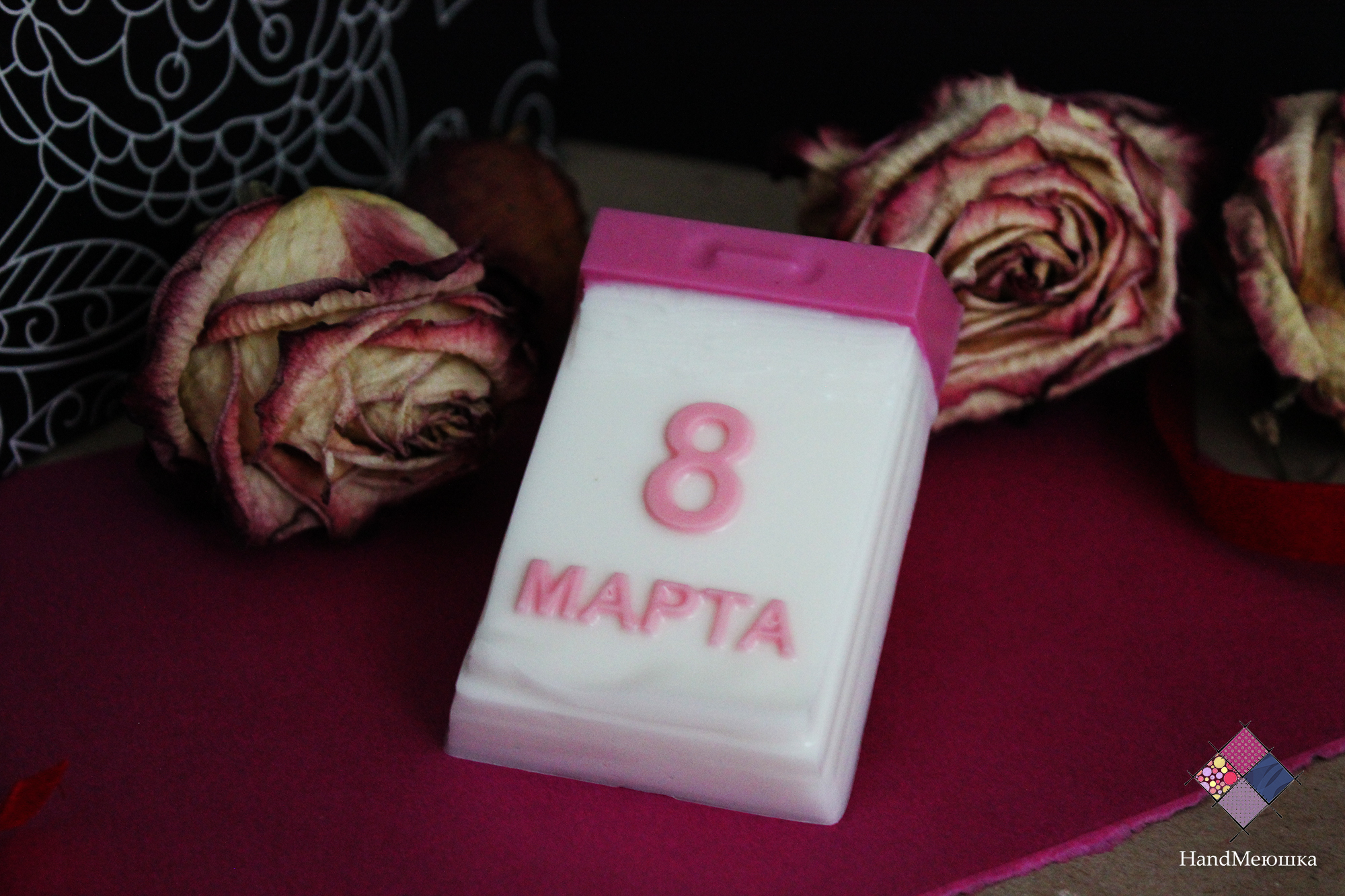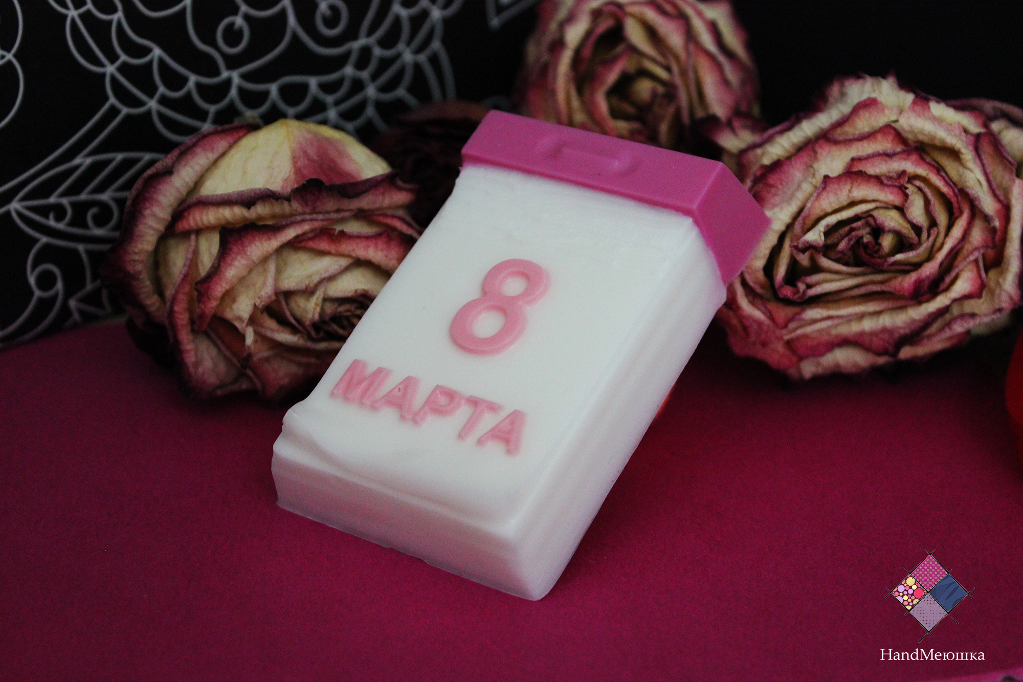 Мыло в виде календарика отлично подойдет к подарку на 8 марта. Очень символичное мыльце как раз к данному празднику. Добавленное масло виноградных косточек увлажнит кожу , не будет сушить её.Мыло обладает ароматом свежей сирени. Как жаль , что здесь невозможно передать этот потрясающий запах, нужно ощутить его наяву.